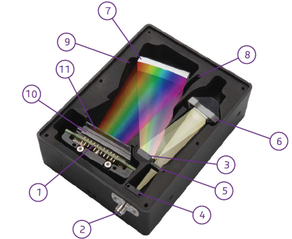 荷蘭Avantes公司的AvaSpec-ULS4096CL光纖光譜儀,采用對稱式光路設(shè)計,焦距75mm,包括光纖接頭(標(biāo)準(zhǔn)SMA接口)、準(zhǔn)直鏡、衍射光柵、聚焦鏡和4096像素線陣CMOS探測器,波長范圍200-1100nm,分辨率高達(dá)0.04nm,提供USB3.0接口、高速網(wǎng)口和I/O外觸發(fā)同步接口。