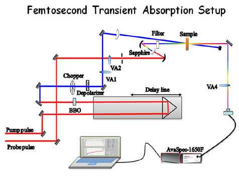 當(dāng)一個分子吸收一個光子時,它將能量賦予該分子,使其暫時從基態(tài)激發(fā)到更高的電子能級或振動能級。由于能量守恒定律,只有當(dāng)光子能量正好等于基態(tài)和激發(fā)態(tài)的差時,光子才能被吸收,且分子的數(shù)量和被吸收光子的數(shù)量有直接的關(guān)系,進而可直接確定分子的密度。因此,吸收是常用的光譜技術(shù)之一,特別是在濃度測量方面。由吸收引起的激發(fā)態(tài)壽命大多數(shù)都非常短暫,通常為飛秒或皮秒量級,但亞穩(wěn)定激發(fā)態(tài)除外。基于這一事實,1950年,喬治·波特和羅納德·諾里什在劍橋大學(xué)時意識到他們可以使用閃光燈通過一種稱為閃光光解的方法來研究分子間的能量轉(zhuǎn)換[1]。直到超快鎖模激光器的發(fā)明,科學(xué)家們才得以充分利用波特和諾里什的貢獻,他們兩人因為這一發(fā)現(xiàn)獲得了1967年的諾貝爾化學(xué)獎。今天,超快激光器已經(jīng)取代了閃光燈成為這些類型的實驗選擇的激發(fā)光源,這種技術(shù)更常被稱為瞬態(tài)吸收光譜法(TAS)。