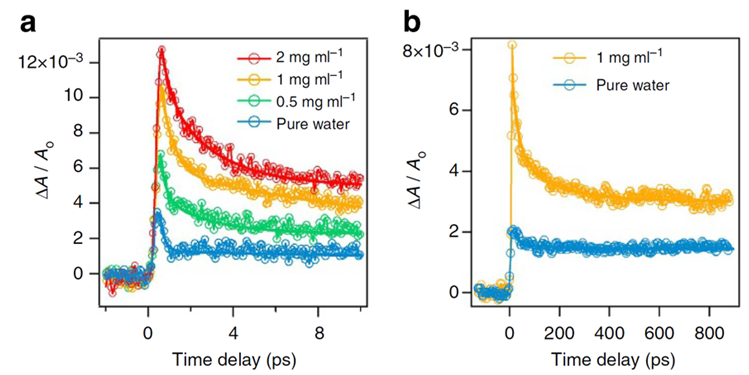 Avantes光譜儀已經(jīng)廣泛被科學(xué)團隊用來測量瞬態(tài)吸收光譜。布里斯托大學(xué)一個小組發(fā)表的關(guān)于腺嘌呤水溶液中N-H鍵裂變的文章就是一個很好的例子,該文章具體地展示了瞬態(tài)吸收光譜數(shù)據(jù)的功能[2]。圖五的結(jié)果是用Avantes公司生產(chǎn)的AvaSpec-FAST型號光譜儀測試得到的,該光譜儀只用750個像素測試200-620 nm的波長范圍,樣品被266 nm泵浦激光和超連續(xù)探測激光激發(fā),脈沖延遲從-500 fs到3 ps。從以下數(shù)據(jù)可以直觀看出,樣品經(jīng)激光脈沖激發(fā)后,其吸收系數(shù)變化與時間有關(guān)系。研究人員根據(jù)圖5b的擬合曲線確定了自發(fā)壽命(或者他們所說的時間常數(shù))為470 +/- 18 fs。