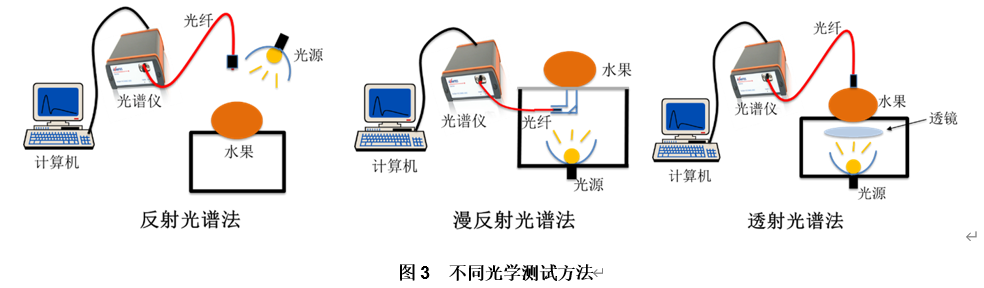 目前用于水果無損檢測的主要光譜檢測方法有反射光譜法、漫反射光譜法、透射光譜法,其光路分別如下圖所示。在這些光路中,光源可采用單個或多個50 W鹵素燈組合的方式,既可以提高光照功率,也可以提高光照均勻度。光譜儀可以采用Avantes生產(chǎn)的光纖光譜儀,其體積小,方便集成到系統(tǒng)中,波長范圍最多可以覆蓋200-2500 nm,最短積分時間可以達到2 μs,滿足對全部物料快速、高效的測試需求。光纖可采用Avantes 800 μm或者1000 μm的大芯徑,提高光通量,金屬鎧甲包層可保護光纖避免損傷。此外,Avantes也可提供多種附件選擇,滿足不同的應(yīng)用場景。