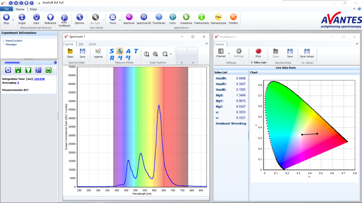 圖3 實時監(jiān)測各參數(shù)變化 2.2 測量方法 圖4 屏幕測量示意圖 2.3 測量項目 LCD和OLED屏幕測量有很特別的應(yīng)用需求,Avantes在顯示屏幕領(lǐng)域研究多年,公司在配置系統(tǒng)和應(yīng)用方面有豐富的經(jīng)驗,可以幫助客戶配置適合其應(yīng)用的系統(tǒng)。主要測量項目: 1. 顯示屏的亮度、色度、光譜; 3.結(jié)論 經(jīng)典配置為: 光譜儀AvaSpec-ULS2048CL-EVO; 通光狹縫25或50微米; 測量范圍360-1000nm; 分辨率(FWHM)為1.4-2.4nm; 2米長專業(yè)測量光纖(FC-UVIR200-2-ME),光纖的測量端配有直徑3.9mm的余弦校正器(CC-UV/VIS)。 整個系統(tǒng)用NIST可溯源標準光源在特定的波長范圍做特定的輻射定標(μW/cm2/nm),定標后的系統(tǒng)可用AvaSoft-IRRAD軟件來測量并得到以下參數(shù):X, Y, Z, x, y, z, u, v, CRI、色溫、主波長、補色主波長、半高寬、峰值波長、色差ΔE等。此外,原始數(shù)據(jù)和色坐標也可以顯示。客戶可用Avantes提供的動態(tài)鏈接庫(DLL)可通過C#、C++及其他的編譯環(huán)境進行二次開發(fā)。